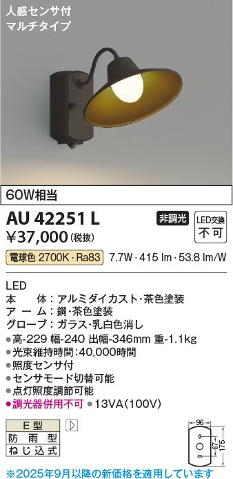 コイズミ照明 AU42251L ポーチライト ブラケットライト 壁 マルチタイプ 人感センサ付 LED一体型 電球色 茶色塗装 防雨型 [au42251l]
