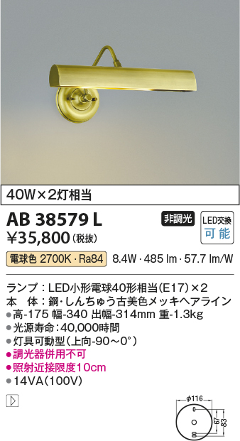 コイズミ照明 AB38579L ブラケット LEDピクチャーライト LED付 電球色 白熱球40W×2灯相当 灯具可動型 しんちゅう古美 [ab38579l]