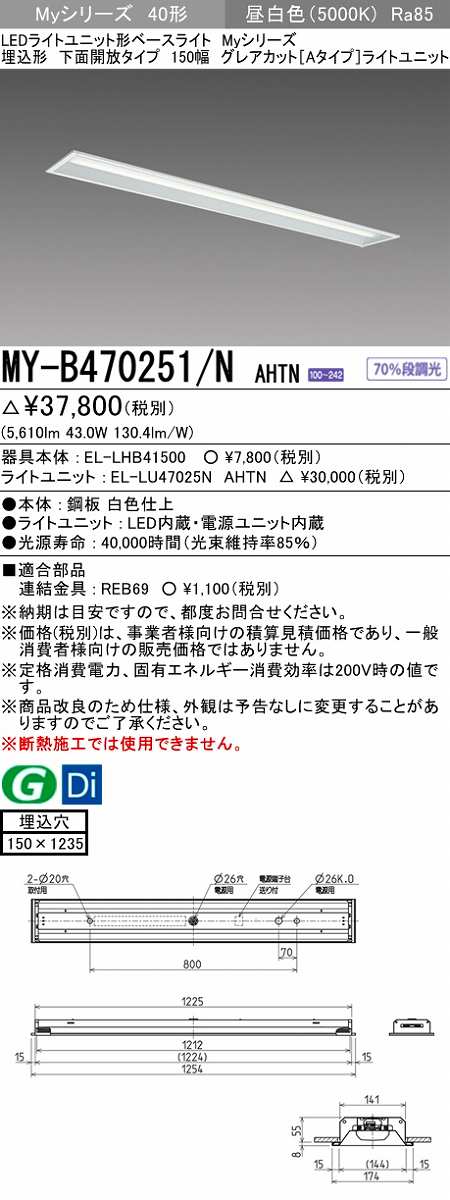 三菱 MY-B470251/N AHTN LEDライトユニット形ベースライト 埋込形 150幅 グレアカットタイプ 固定出力・段調光 昼白色 受注生産 [§] [my-b470251-nahtn]