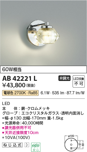 コイズミ照明 AB42221L Twinly 白熱球60W相当 LED一体型 電球色 エコクリスタルガラス・シルバー [ab42221l]
