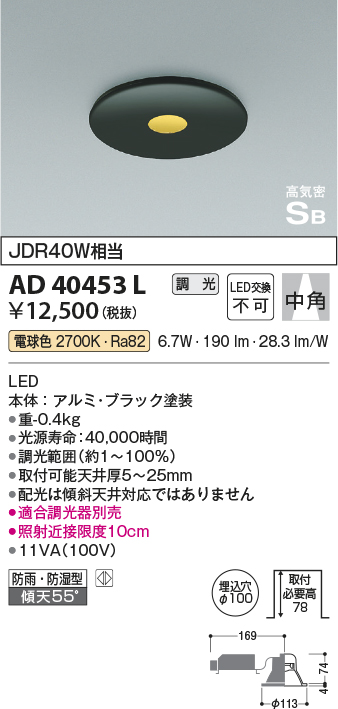 コイズミ照明 AD40453L ピンホールダウンライト 高気密SB 調光 ベースタイプ JDR40W相当 電球色 LED一体型 埋込穴φ100 防雨 防湿 [ad40453l]