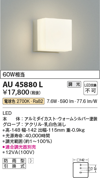 コイズミ照明 AU45880L ポーチライト 壁 ブラケットライト LED一体型 電球色 防雨型 ウォームシルバー [au45880l]