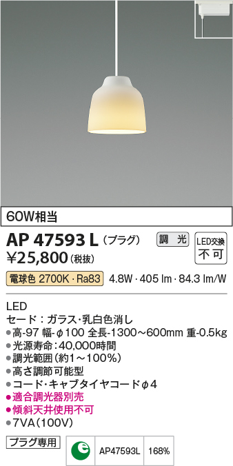 コイズミ照明 AP47593L ペンダント LED一体型 調光 電球色 プラグ ガラス・乳白色消し [♭]