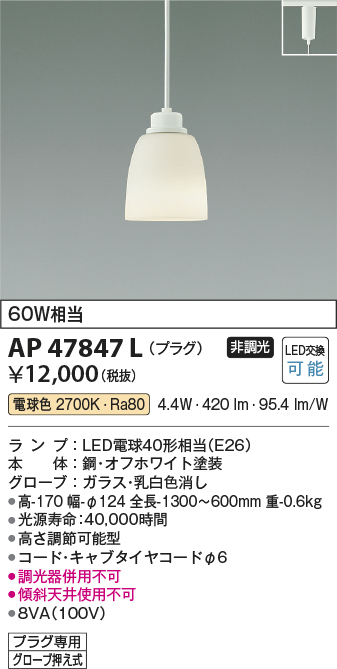 コイズミ照明 AP47847L ペンダント LEDランプ交換可能型 電球色 プラグ オフホワイト塗装 [♭] [ap47847l]