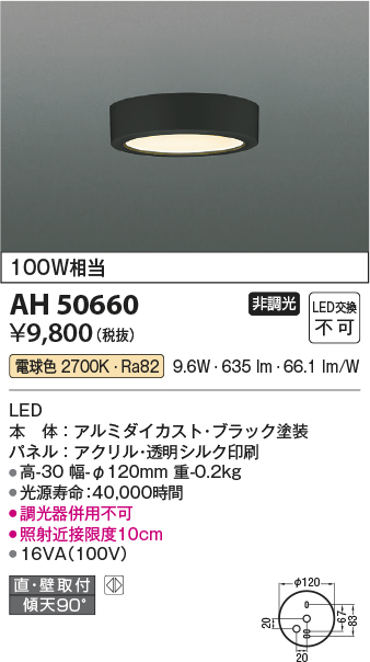 コイズミ照明 AH50660 小型シーリング LED一体型 非調光 電球色 直・壁取付 傾斜天井対応 ブラック