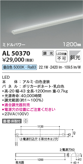 コイズミ照明 AL50370 間接照明 LED一体型 調光 昼白色 斜光 直・壁・床置取付 1200mm ホワイト