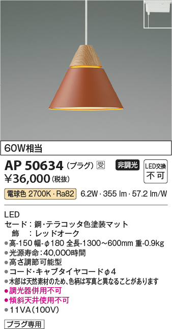 コイズミ照明 AP50634 ペンダントライト LED一体型 非調光 電球色 プラグタイプ テラコッタ 受注生産品 [§] [ap50634]