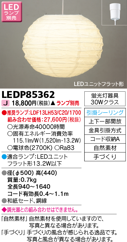 東芝ライテック LEDP85362 和風照明 ペンダント LEDユニットフラット形 フランジタイプ 引掛シーリング 手づくり ランプ別売 [♭]