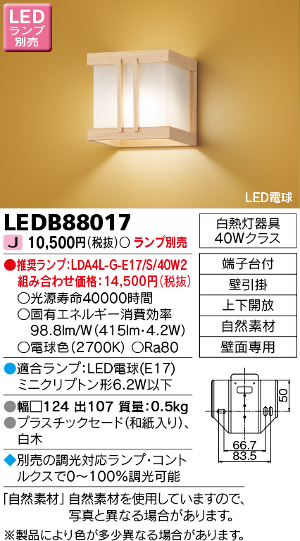 東芝ライテック LEDB88017 和風照明 ブラケット LED電球 上下開放 白木 ランプ別売 [ledb88017]