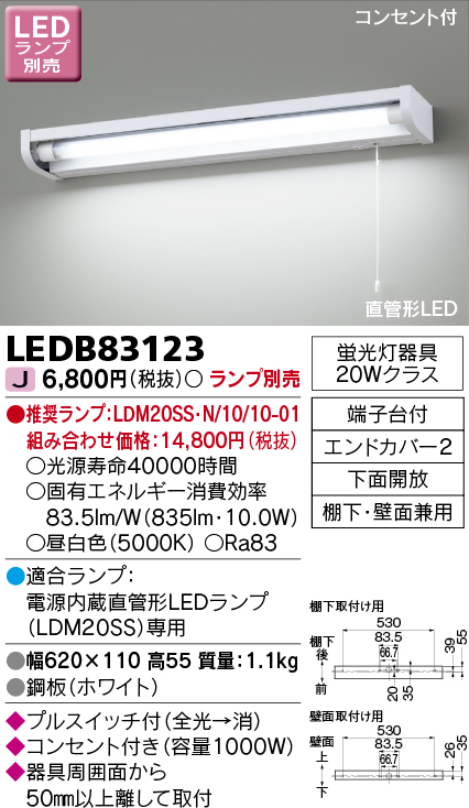 東芝ライテック LEDB83123 キッチン 流し元灯 電源内蔵直管形LED プルスイッチ付 棚下・壁面兼用タイプ コンセント付 下面開放 ランプ別売 [ledb83123]