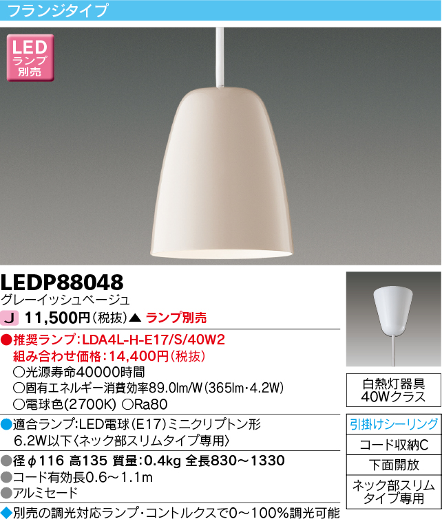 東芝ライテック LEDP88048 ペンダント フランジタイプ 引掛シーリング 下面開放 グレーイッシュベージュ ランプ別売