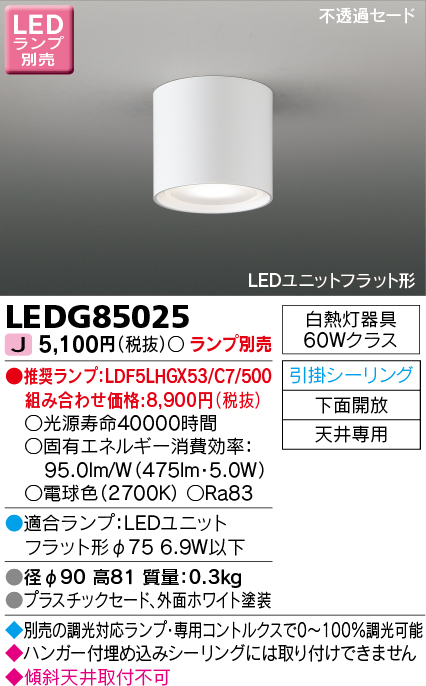 東芝ライテック LEDG85025 小形シーリングライト LEDユニット フラット形 引掛シーリング 下面開放 ランプ別売 [ledg85025]