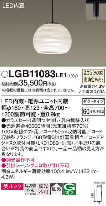 パナソニック LGB11083LE1 ペンダント 吊下型 LED(温白色) 美ルック ガラスセード 拡散 ダクトタイプ [♭] [lgb11083le1]