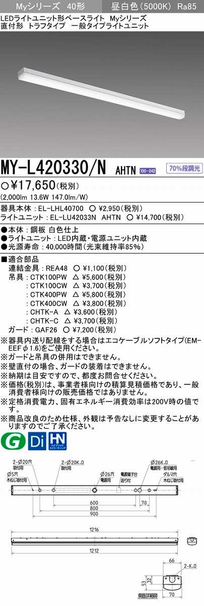 【メーカー品薄】三菱 MY-L420330/N AHTN LEDライトユニット形ベースライト 直付形 トラフ 一般タイプ 固定出力 昼白色 [my-l420330-nahtn]