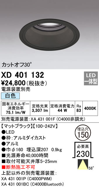 オーデリック XD401132 ダウンライト φ150 電源装置別売 LED一体型 白色 カットオフ30° マットブラック [xd401132]