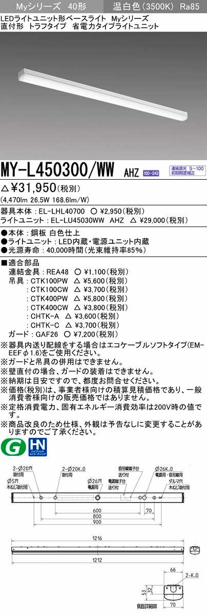 三菱 MY-L450300/WW AHZ LEDライトユニット形ベースライト 直付形 トラフ 省電力タイプ 初期照度補正付連続調光 温白色 受注生産品 [§] [my-l450300-wwahz]