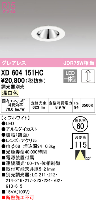 オーデリック XD604151HC グレアレスベースダウンライト LED一体型 位相調光 温白色 調光器別売 オフホワイト