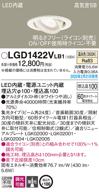パナソニック LGD1422VLB1 ユニバーサルダウンライト 天井埋込型 LED(温白色) 高気密SB形 集光24度 調光(ライコン別売) 埋込穴φ100 ホワイト