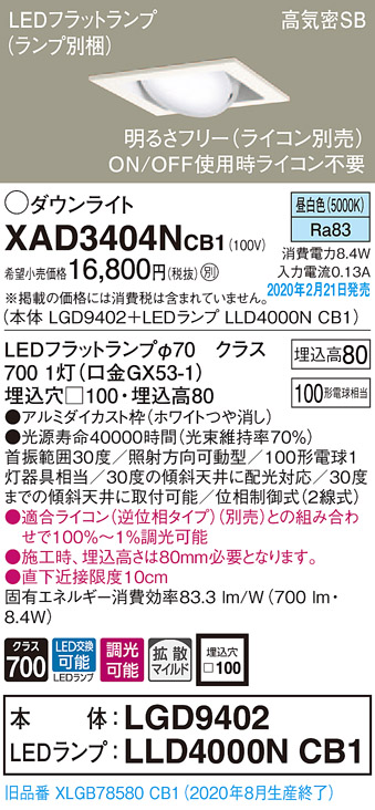 パナソニック XAD3404NCB1 ユニバーサルダウンライト 天井埋込型 LED(昼白色) 高気密SB形 拡散マイルド配光 調光(ライコン別売) 埋込穴□100 ホワイト