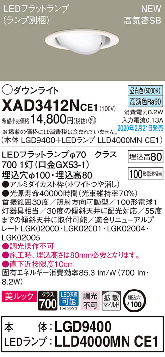 パナソニック XAD3412NCE1 ユニバーサルダウンライト 天井埋込型 LED(昼白色) 高気密SB形 拡散マイルド配光 埋込穴φ100 ホワイト