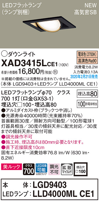 パナソニック XAD3415LCE1 ユニバーサルダウンライト 天井埋込型 LED(電球色) 高気密SB形 拡散マイルド配光 埋込穴□100 ブラック [xad3415lce1]