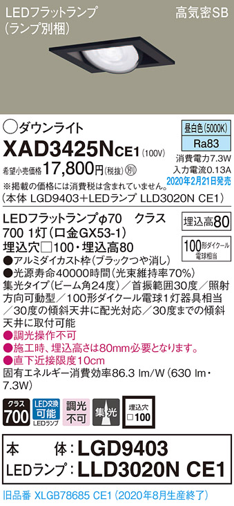 パナソニック XAD3425NCE1 ユニバーサルダウンライト 天井埋込型 LED(昼白色) 高気密SB形 集光24度 埋込穴□100 ブラック
