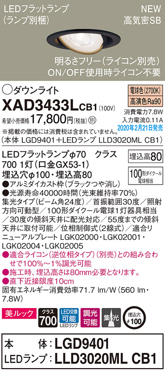 パナソニック XAD3433LCB1 ユニバーサルダウンライト 天井埋込型 LED(電球色) 高気密SB形 集光24度 調光(ライコン別売) 埋込穴φ100 ブラック