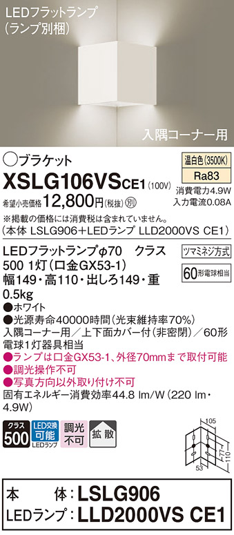 パナソニック XSLG106VSCE1(ランプ別梱包) ブラケット 壁直付型 LED(温白色) 入隅コーナー用 上下面カバー付(非密閉)・拡散 [xslg106vsce1]