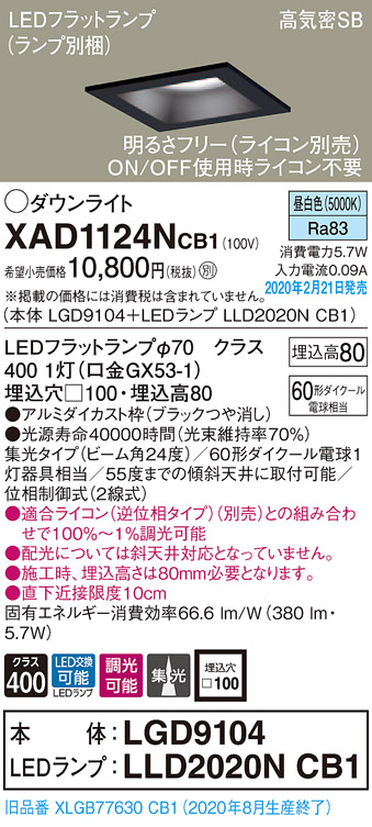 パナソニック XAD1124NCB1(ランプ別梱) ダウンライト 天井埋込型 LED(昼白色) 高気密SB形 集光24度 調光(ライコン別売) 埋込穴□100 ブラック