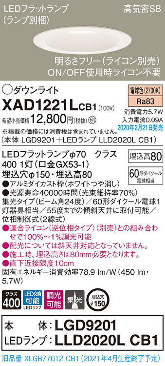 パナソニック XAD1221LCB1(ランプ別梱) ダウンライト 天井埋込型 LED(電球色) 高気密SB形 集光24度 調光(ライコン別売) 埋込穴φ150 ホワイト [xad1221lcb1]