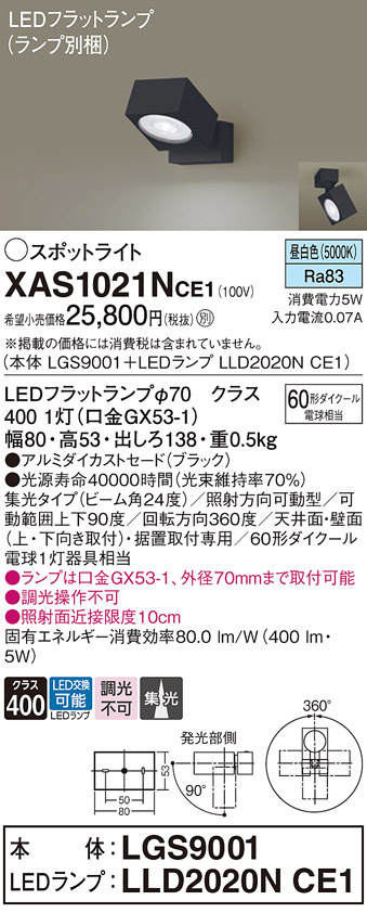 パナソニック XAS1021NCE1(ランプ別梱) スポットライト 天井直付型・壁直付型・据置取付型 LED(昼白色) 集光24度 ブラック