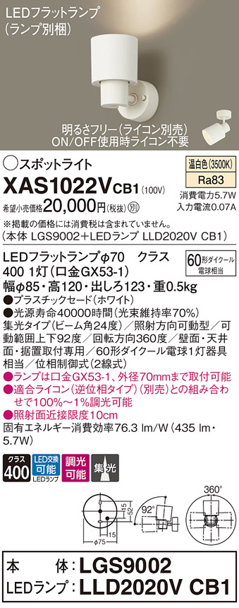 パナソニック XAS1022VCB1(ランプ別梱) スポットライト 天井直付型・壁直付型・据置取付型 LED(温白色) 集光24度 調光(ライコン別売) ホワイト [xas1022vcb1]
