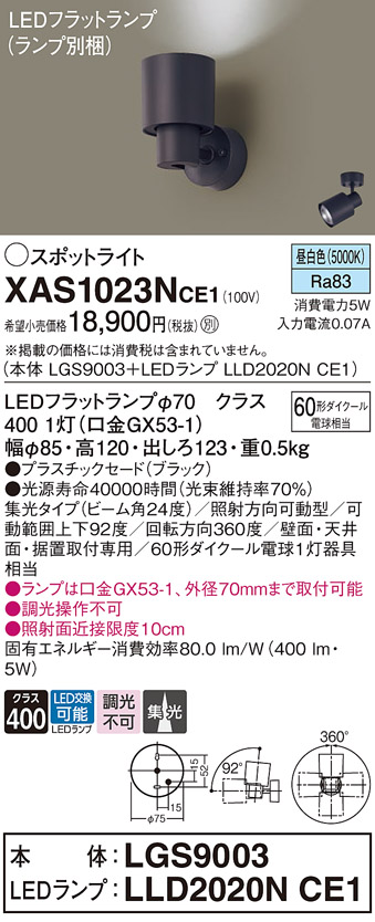 パナソニック XAS1023NCE1(ランプ別梱) スポットライト 天井直付型・壁直付型・据置取付型 LED(昼白色) 集光24度 ブラック