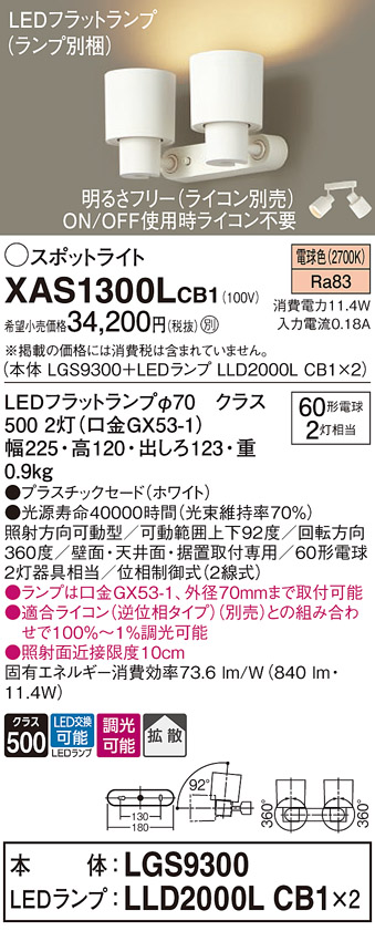 パナソニック XAS1300LCB1(ランプ別梱) スポットライト 天井直付型・壁直付型・据置取付型 LED(電球色) 拡散タイプ 調光(ライコン別売) ホワイト [xas1300lcb1]