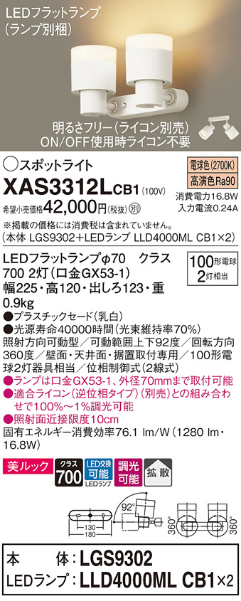 パナソニック XAS3312LCB1(ランプ別梱) スポットライト 天井直付型・壁直付型・据置取付型 LED(電球色) 美ルック 拡散タイプ 調光(ライコン別売) 乳白