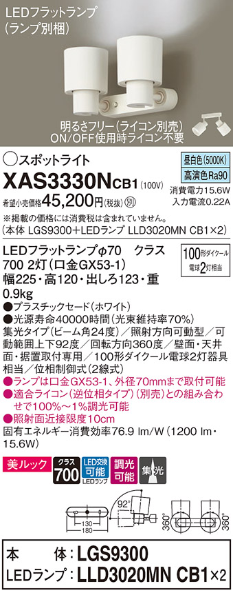 パナソニック XAS3330NCB1(ランプ別梱) スポットライト 天井直付型・壁直付型・据置取付型 LED(昼白色) 美ルック 集光24度 調光(ライコン別売) ホワイト [xas3330ncb1]