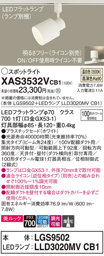 パナソニック XAS3532VCB1(ランプ別梱) スポットライト 配線ダクト取付型 LED(温白色) 美ルック 集光24度 調光(ライコン別売) ホワイト [xas3532vcb1]