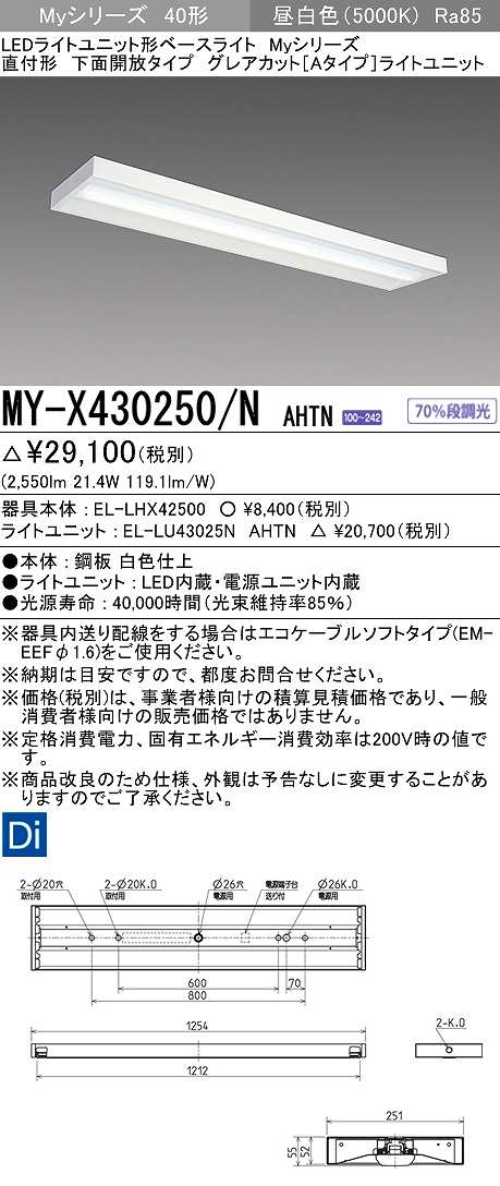三菱 MY-X430250/N AHTN LEDライトユニット形ベースライト 直付形 下面開放 グレアカットタイプ 固定出力 昼白色 受注生産品 [§] [my-x430250-nahtn]