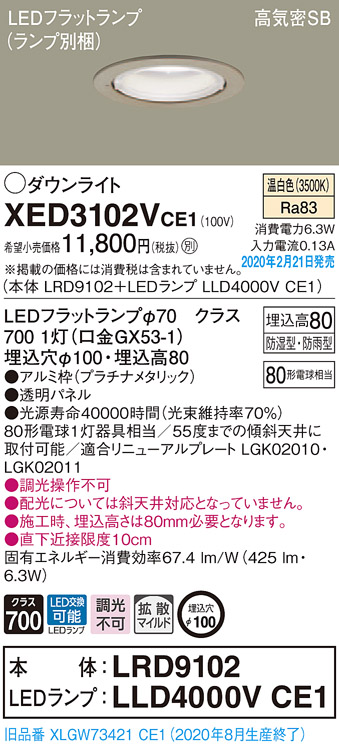 パナソニック XED3102VCE1(ランプ別梱) 軒下用ダウンライト 天井埋込型 LED(温白色) 拡散マイルド配光 防湿・防雨型 埋込穴φ100 プラチナメタリック