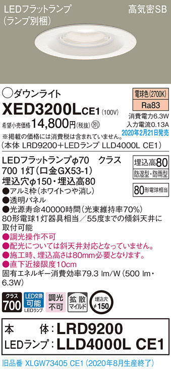 パナソニック XED3200LCE1(ランプ別梱) 軒下用ダウンライト 天井埋込型 LED(電球色) 拡散マイルド配光 防湿・防雨型 埋込穴φ150 ホワイト [xed3200lce1]