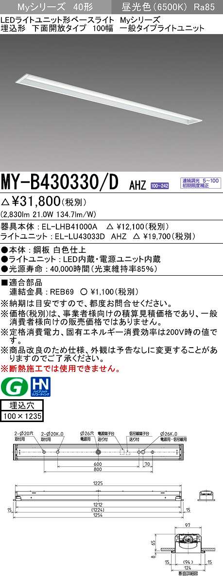 三菱 MY-B430330/D AHZ LEDライトユニット形ベースライト 埋込形 下面開放 一般タイプ 初期照度補正付連続調光 昼光色 受注生産品 [§] [my-b430330-dahz]