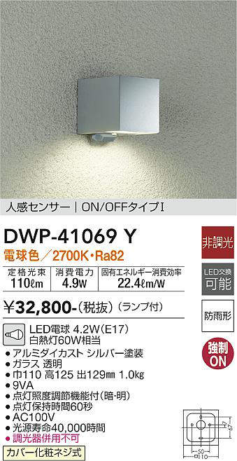大光電機(DAIKO) DWP-41069Y アウトドアライト ポーチ灯 LED ランプ付 非調光 電球色 人感センサー付タイプ ON-OFFタイプ 防雨形 シルバー