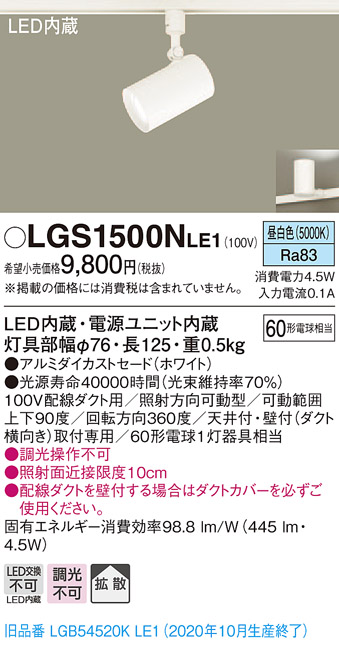 パナソニック LGS1500NLE1 スポットライト 配線ダクト取付型 LED(昼白色) 拡散タイプ ホワイト [lgs1500nle1]