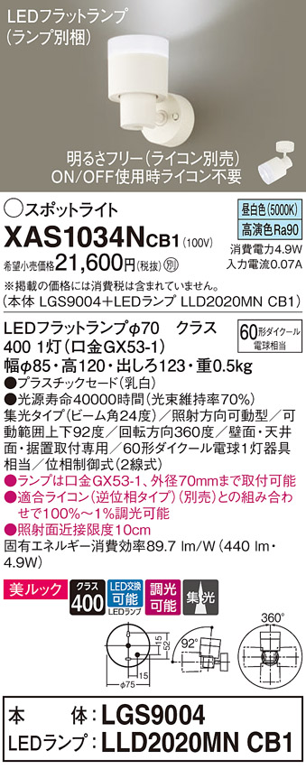 パナソニック XAS1034NCB1(ランプ別梱) スポットライト 天井直付型・壁直付型・据置取付型 LED(昼白色) 美ルック 集光24度 調光(ライコン別売) 乳白 [xas1034ncb1]