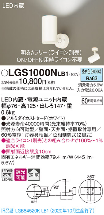 パナソニック LGS1000NLB1 スポットライト 天井直付型・壁直付型・据置取付型 LED(昼白色) 拡散タイプ 調光(ライコン別売) ホワイト