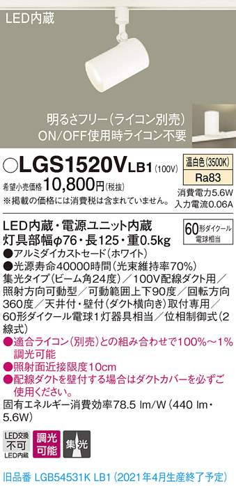 パナソニック LGS1520VLB1 スポットライト 配線ダクト取付型 LED(温白色) 集光24度 調光(ライコン別売) ホワイト [lgs1520vlb1]
