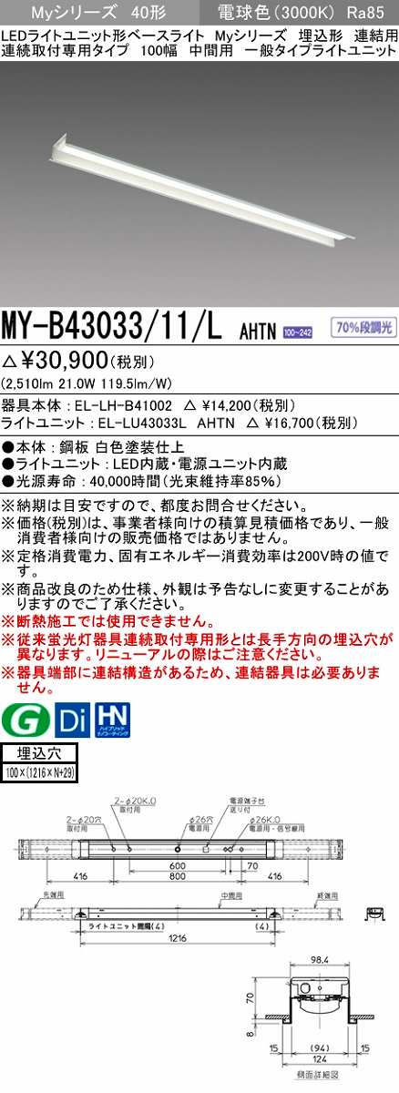 三菱 MY-B43033/11/L AHTN LEDライトユニット形ベースライト 埋込形 連結用 連続取付専用 一般タイプ 中間用 固定出力 電球色 受注生産品 [§] [my-b43033-11-lahtn]