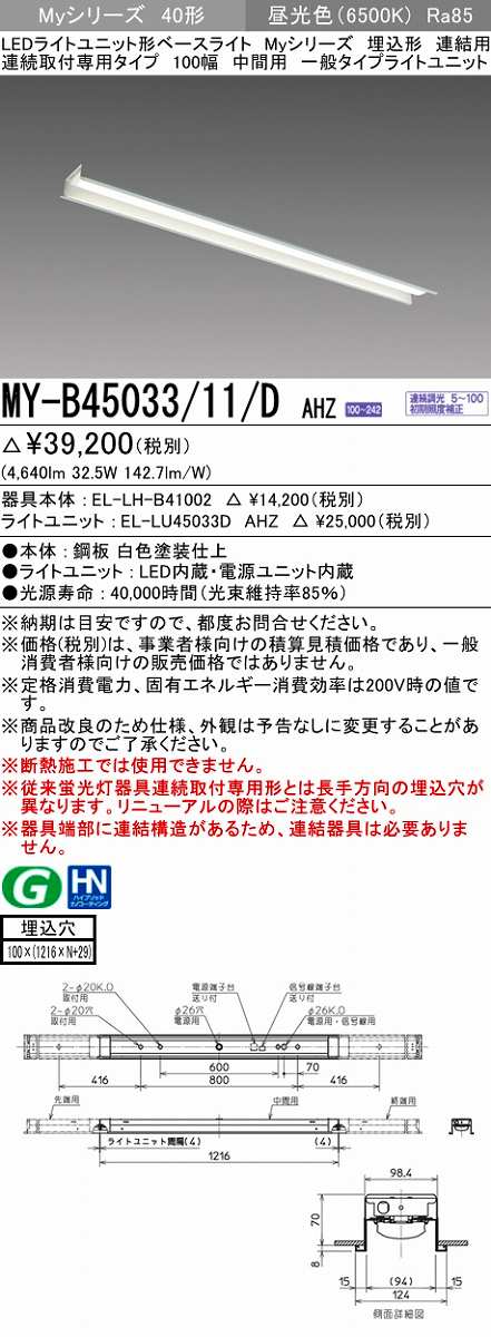 三菱 MY-B45033/11/D AHZ LEDライトユニット形ベースライト 埋込形 連結用 連続取付専用 一般タイプ 中間用 初期照度補正付連続調光 昼光色 受注生産品 [§] [my-b45033-11-dahz]