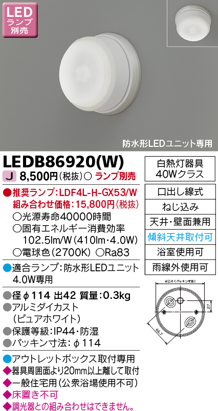 東芝ライテック LEDB86920(W) アウトドア 防水形LEDユニット 軒下シーリングライト フラット形・ドーム形専用 電球色 Φ100 ランプ別売 [ledb86920-w]