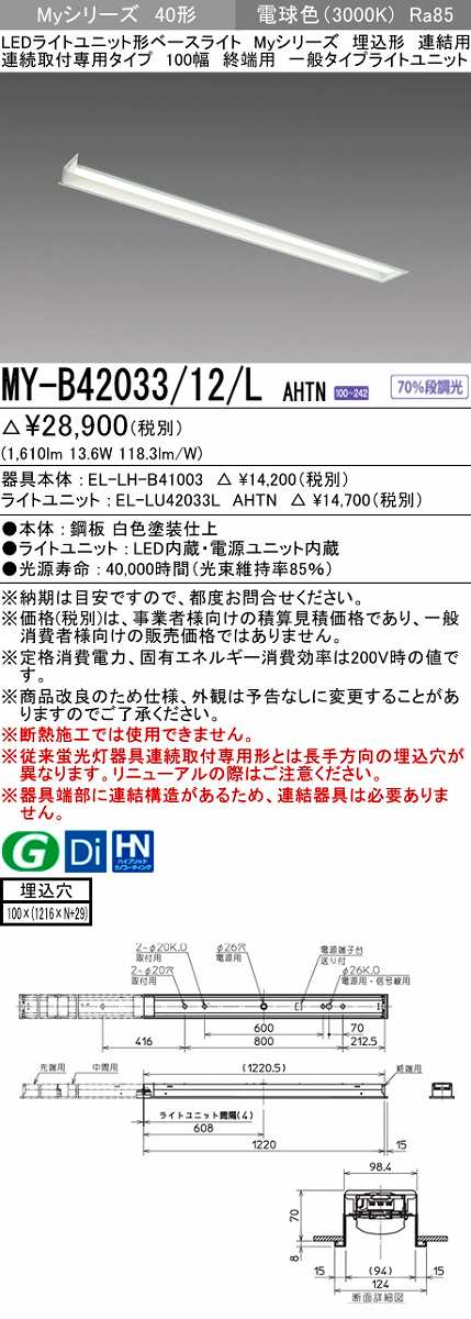 三菱 MY-B42033/12/L AHTN LEDライトユニット形ベースライト 埋込形 連結用 連続取付専用 一般タイプ 終端用 固定出力 電球色 受注生産品 [§] [my-b42033-12-lahtn]
